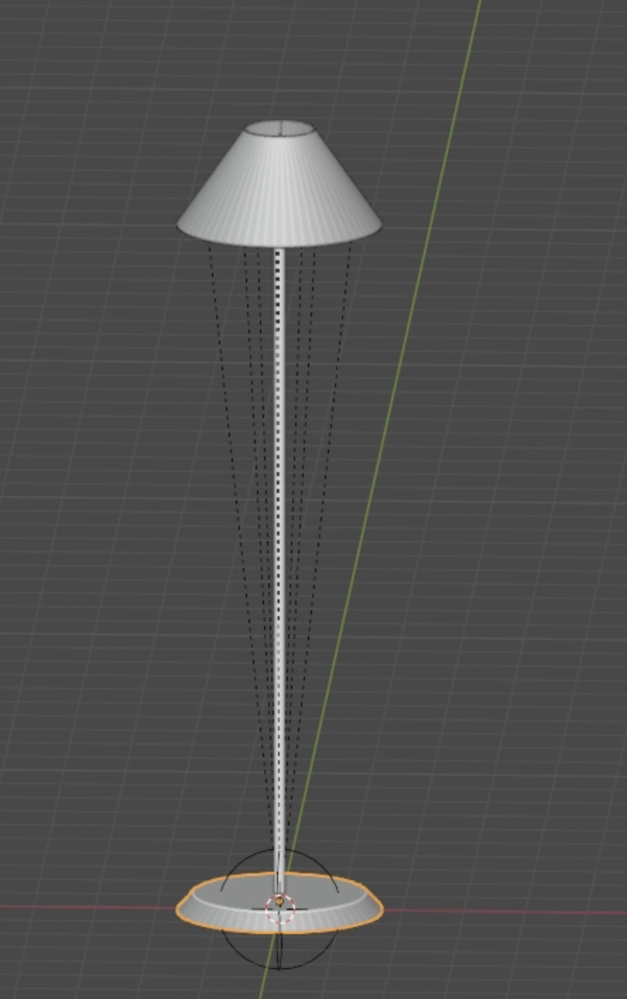 이제 다른 실린더를 추가할 수 있습니다. 이 실린더는 이 값을 가지지 않을 것입니다. 아마도 0.1 정도로 늘릴 것입니다. 이 정도면 좋습니다. 그리고 깊이와 위치를 늘릴 것입니다. 좋습니다. 그리고 필요에 맞는 올바른 값을 찾으려고 노력할 것입니다. 여기 깊이를 줄이고 이제 이런 큰 램프를 가졌습니다. 이 두 개의 새로운 오브젝트를 여기에 있는 엠티에 다시 페어런팅하기만 하면 됩니다. Ctrl P를 눌러 오브젝트에 페어런트를 설정합니다. 좋습니다. 이제 이것은 플로어 램프입니다. 완벽합니다.