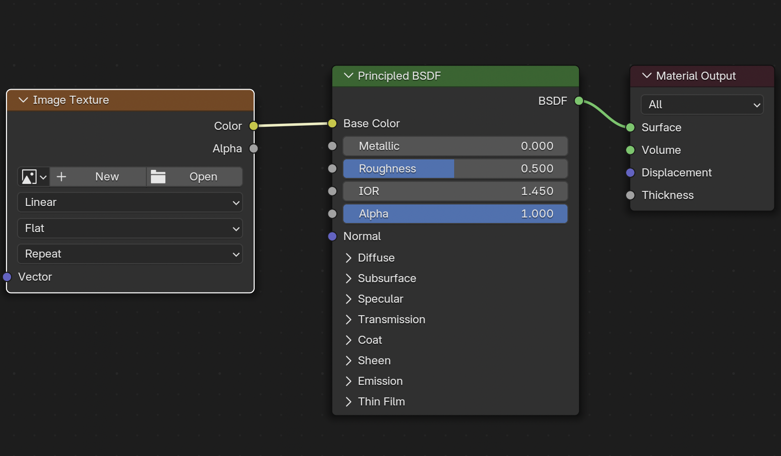 - Base Color 연결: 기본 색상을 머티리얼의 Base Color에 연결