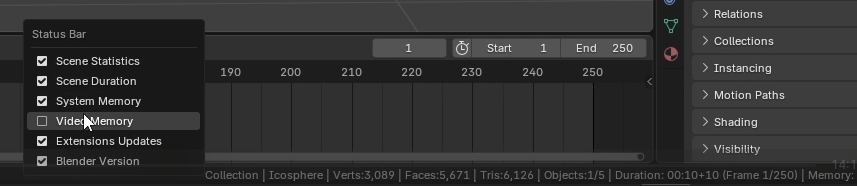 씬의 꼭지점 수를 확인하려면 오른쪽 클릭으로 **씬 통계(Scene statistics)**를 활성화할 수 있습니다. 씬 통계 외에도 씬 지속 시간, 씬 시스템 메모리, 비디오 메모리 사용량도 확인할 수 있습니다. 저는 씬 지속 시간은 공간을 많이 차지하지 않으므로 사용하지 않습니다. 씬 통계는 모델링 중에 도움이 되는 몇 가지 정보를 제공합니다. 예를 들어, 씬의 꼭지점 수, 면 수, 삼각형 수, 현재 선택된 객체 수 (현재 씬에 있는 5개의 객체 중 1개가 선택됨), 메모리 사용량, 비디오 메모리 사용량 등을 볼 수 있습니다. 이 정보는 항상 확인하는 것이 좋습니다.