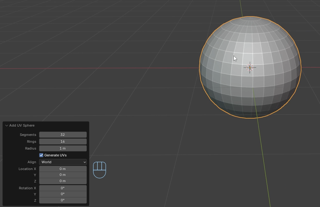 다음은 **UV 스피어(UV Sphere)**입니다. UV 스피어는 세그먼트 수와 링 수를 조절할 수 있는 옵션을 가집니다. 구형 형태의 객체를 만들 때 매우 유용하게 사용될 수 있습니다.