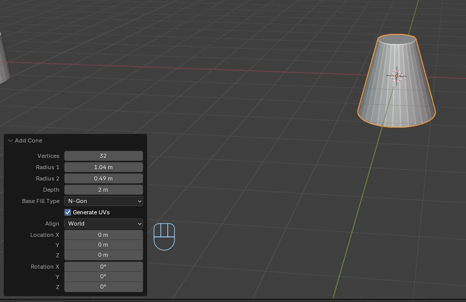 다음은 콘입니다. 콘은 실린더와 거의 동일하지만, 밑면의 반지름과 상단의 반지름이라는 두 가지 반지름을 가지고 있습니다. 램프 모양이나 파이프가 갑자기 좁아지는 형태 등을 만들 때 유용합니다.