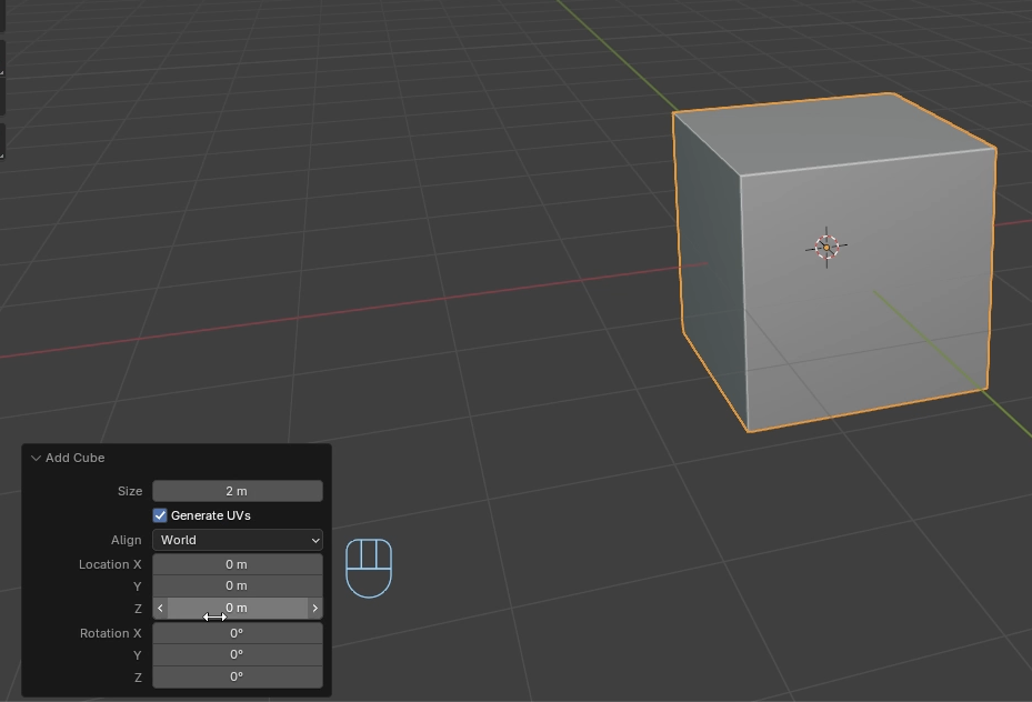 다음은 큐브입니다. 큐브는 기본적으로 2미터 크기입니다. 블렌더에서는 모든 단위가 미터로 되어 있으며, 이에 대해서는 나중에 다시 이야기할 것입니다. 큐브도 플레인과 동일한 종류의 옵션을 가지고 있습니다.