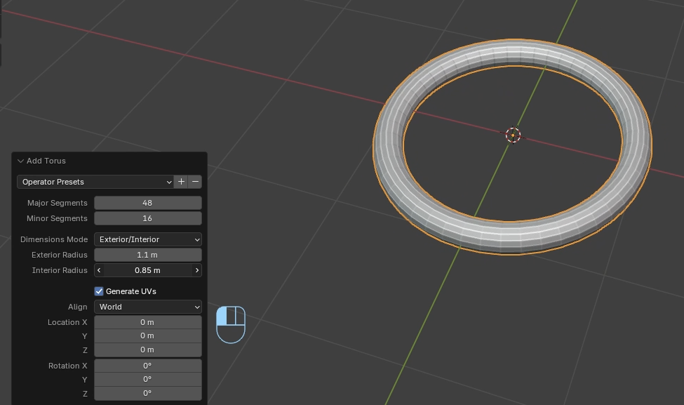 그리고 **토러스(Torus)**가 있습니다. 토러스는 도넛 모양과 흡사하며, 메이저 세그먼트 (그 방향의 꼭지점 수)와 링의 수를 늘릴 수 있습니다. 메이저 및 마이너 치수 모드로 플레이할 수 있습니다. 메이저 반지름과 마이너 반지름을 조절할 수 있습니다. 다른 작업을 수행하면 이 옵션으로 다시 돌아올 수 없으므로, 객체를 추가할 때 이 옵션을 주의 깊게 확인해야 합니다. 익스테리어 및 인테리어 반지름을 사용하는 옵션도 있습니다. 모든 객체에 UV 생성 옵션이 있으며, 모든 객체에 월드 옵션도 동일하게 적용됩니다.