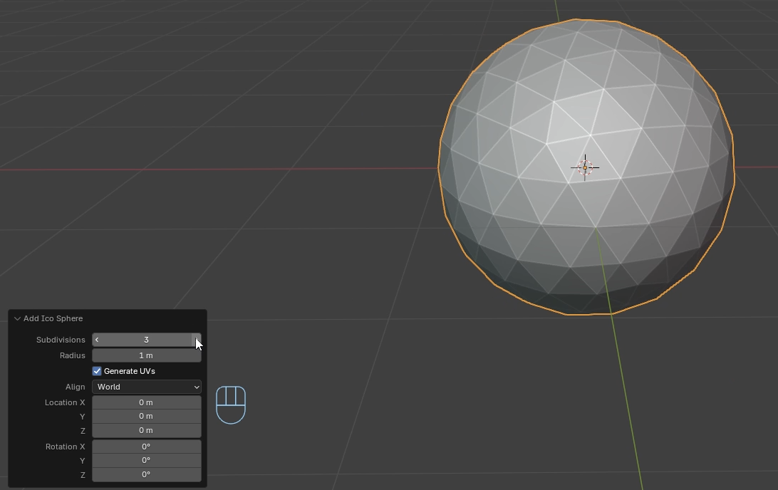 또 다른 구체는 **아이코스피어(Icosphere)**입니다. 아이코스피어는 삼각형으로만 이루어져 있으며, 세분화(subdivision)옵션을 통해 세분화 수준을 늘리면 더 많은 삼각형으로 더 완벽한 모양을 만들 수 있습니다.