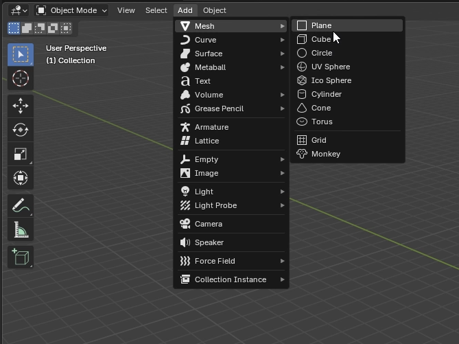 먼저 목록에서 첫 번째인 플레인을 추가해 봅시다. 플레인을 추가하면 작은 메뉴가 나타납니다. 이 메뉴에는 방금 추가한 객체와 관련된 다양한 옵션이 있습니다. 다른 작업을 수행하면 이 메뉴는 사라지므로 주의해야 합니다. 예를 들어, G를 눌러 객체를 이동하면 이 메뉴는 마지막 작업과 관련된 메뉴로 바뀝니다. 즉, 이 메뉴의 옵션은 한 번 선택하면 돌이킬 수 없는 파괴적인 작업과 같습니다.