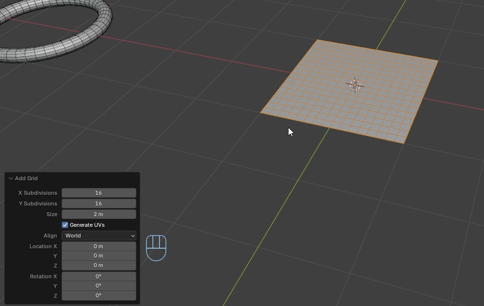 여기서 기본 크기를 선택할 수 있습니다. UV를 생성할지 여부를 선택할 수도 있지만, UV는 나중에 2D 뷰에서 객체를 조작하는 방법에 대해 다룰 것입니다. 또한, 뷰에 정렬할지, 3D 커서에 정렬할지, 월드에 정렬할지 선택할 수 있습니다. 그리고 객체의 위치와 회전을 변경할 수 있지만, 이 작업은 나중에도 할 수 있습니다. 이 객체는 단순히 시작할 수 있는 표면이며 특별한 것은 없습니다. G와 X를 사용하여 객체를 X축으로 이동할 수 있습니다.