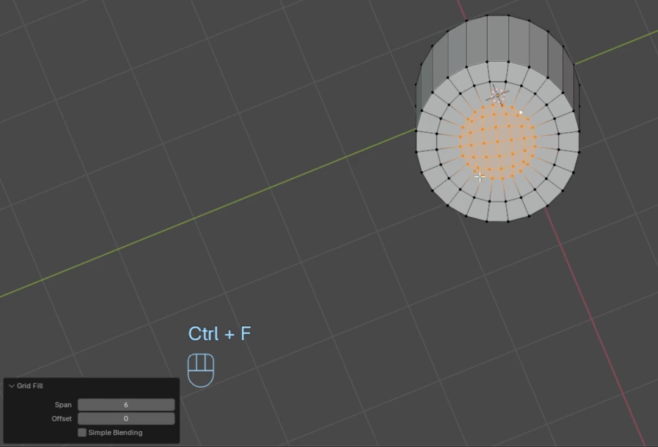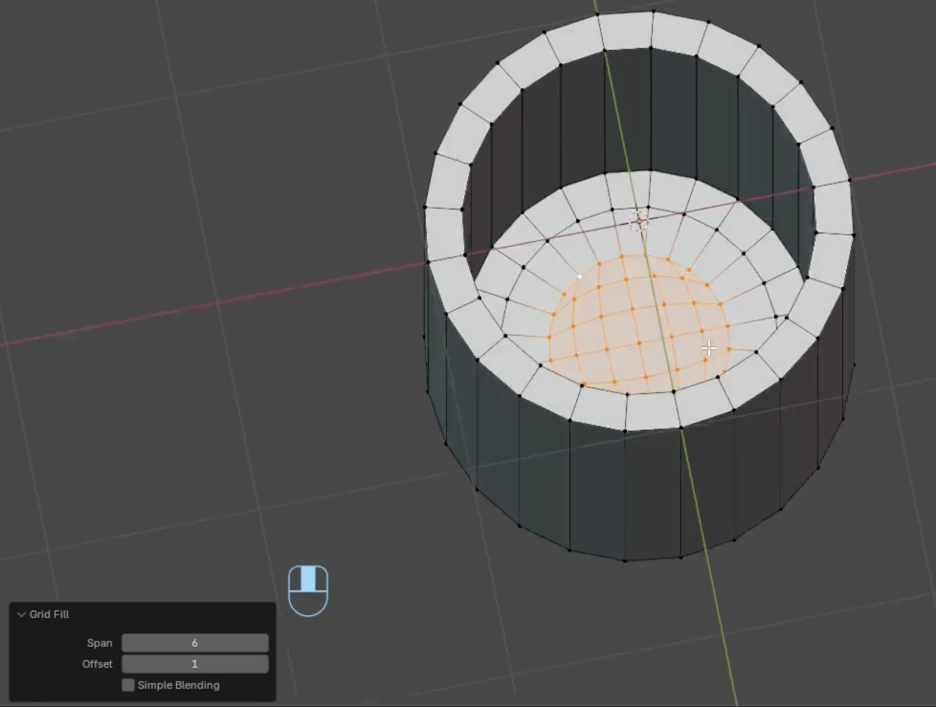 세분화 표면(subdivision surface) 수정자를 잠시 숨기면, 첫 번째 옵션은 모든 것을 직접 닫는 것입니다. 예를 들어 'F'를 눌러 닫으면, 수정자를 활성화했을 때 모양이 완전히 이상해 보이고 쿼드가 아닙니다. 쿼드만 사용하면 Ctrl + F를 눌러 **면 메뉴(face menu)**를 호출하고 **그리드 채우기(grid fill)**를 사용할 수 있지만, 이 경우 완벽하지 않고 원형과 사각형 모양이 섞여 있습니다.