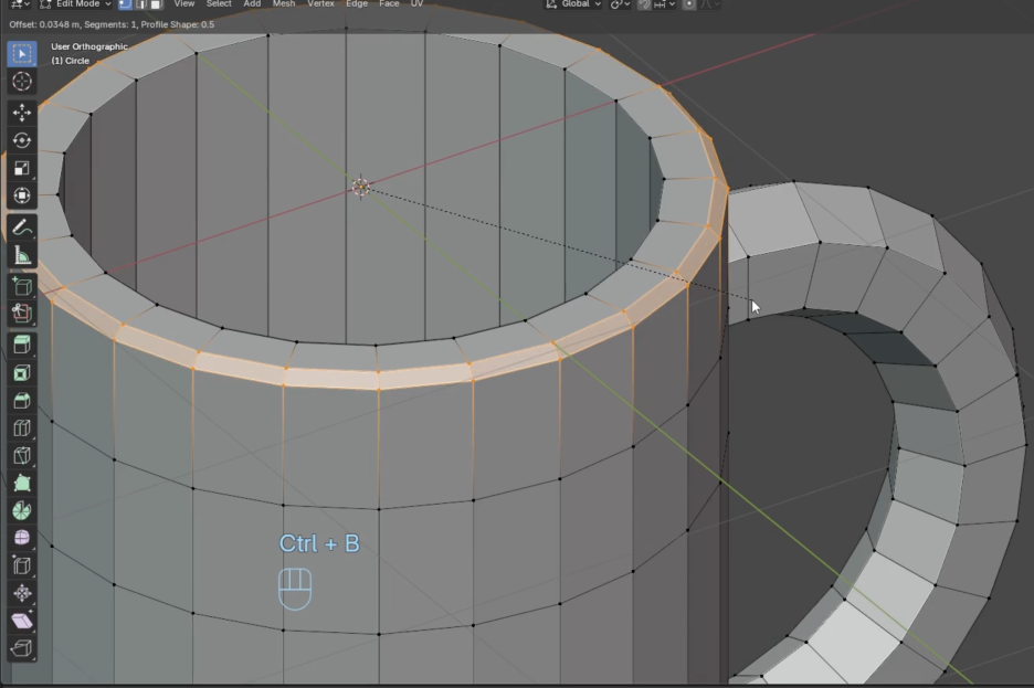 이제 모든 것이 매우 날카로우니 좀 더 **유기적인 모양(organic shape)**을 만들고 싶습니다. 커피를 마시면 입술을 다칠 수 있습니다. 부드럽게 만드는 것은 매우 간단합니다. 부드럽게 만들고 싶은 루프를 선택하고 Ctrl + B를 누릅니다. 많은 정점을 추가하지 않고 두세 개 정도만 추가합니다. 마우스 스크롤로 추가할 정점의 수를 늘릴 수 있습니다. 세분화가 어쨌든 완벽하게 부드럽게 만드는 데 도움이 될 것이므로 너무 많이 추가하고 싶지 않습니다. 같은 작업을 여기저기 반복하여 더 부드러운 연결을 만듭니다. 이제 훨씬 더 나아 보입니다. 이제 **세분화 표면(subdivision surface)**을 활성화하면 모든 것이 매우 잘 부드러워지고, 레벨을 높이면 더 좋아 보입니다.