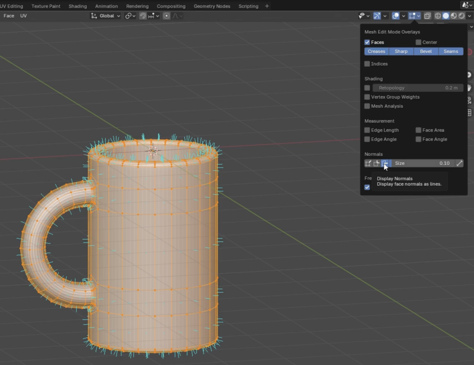 - 노멀 확인(Check Normals): 편집 모드에서 **노멀(normals)**은 항상 외부를 향해야 합니다. 지금은 잘 정렬되어 있지만 때로는 내부를 향할 수도 있습니다. 이렇게 되면 세분화 표면이 제대로 작동하지 않고 노멀이 지오메트리 안에 있게 됩니다. 모델링을 반전시키거나 스케일을 잘못 조정하면 이런 일이 발생할 수 있습니다. 따라서 항상 모든 것을 선택하고 Shift + N을 사용하여 노멀을 외부로 다시 계산하는 것이 매우 중요합니다. 모델링 후에는 항상 Shift + N을 사용하세요.