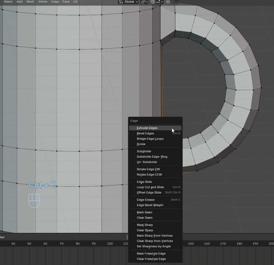 이제 두 루프가 선택되었고, Ctrl + E를 사용하여 **브릿지 엣지 루프(bridge edge loops)**를 사용할 수 있습니다. 이것은 두 루프 사이에 지오메트리를 생성하지만, 동일한 수의 정점이 필요하다는 한계가 있습니다. 예를 들어, 한쪽에 8개, 다른 쪽에 6개의 정점이 있다면 작동하지 않거나 이상한 삼각형을 만듭니다. 따라서 항상 같은 수의 정점을 갖는 것이 좋습니다. 이제 완벽하게 작동합니다.