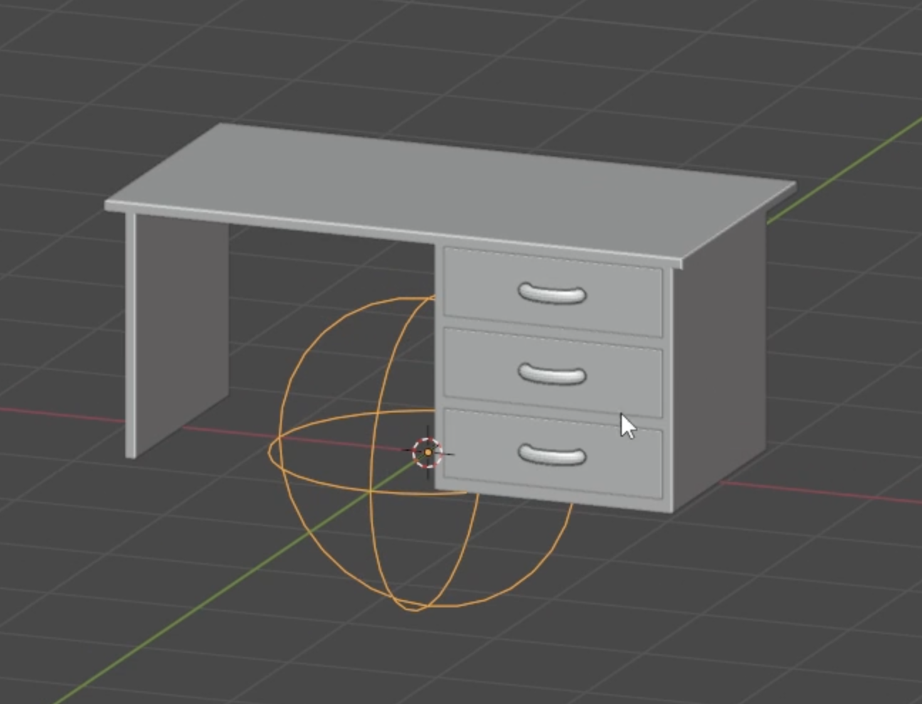 이제 바닥에 놓겠습니다. GZ만 이런 식으로. 그리고 GX를 조금만. 이제 여러 개체가 있으므로  개체를 추가하겠습니다. 커서가 거기에 있으므로 거기에 나타났습니다. Shift+C를 눌러 커서를 중앙으로 이동하고 Shift+A, 빈 스피어를 중앙에 추가하겠습니다. 이것이 우리 책상이 될 것입니다. 그리고 Ctrl+P로 모든 것을 부모로 만들면, 메인 개체를 움직일 수 있고, 예를 들어 서랍을 열 수 있습니다.