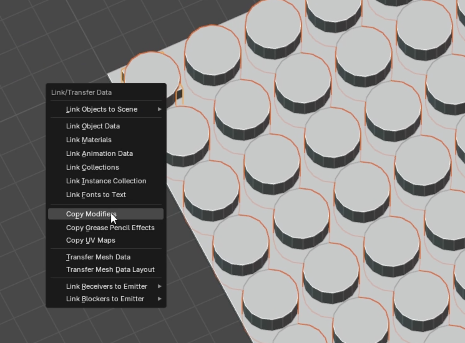 그래서 이 개체를 그 개체와 함께 선택하고 Ctrl+L을 누르고 수정자 복사를 할 수 있습니다. 반대였습니다. 이것을 그것으로, Ctrl+L, 수정자 복사를 하면, 이제 모든 큐브가 동일한 것을 가지고 있다는 것을 알 수 있습니다.