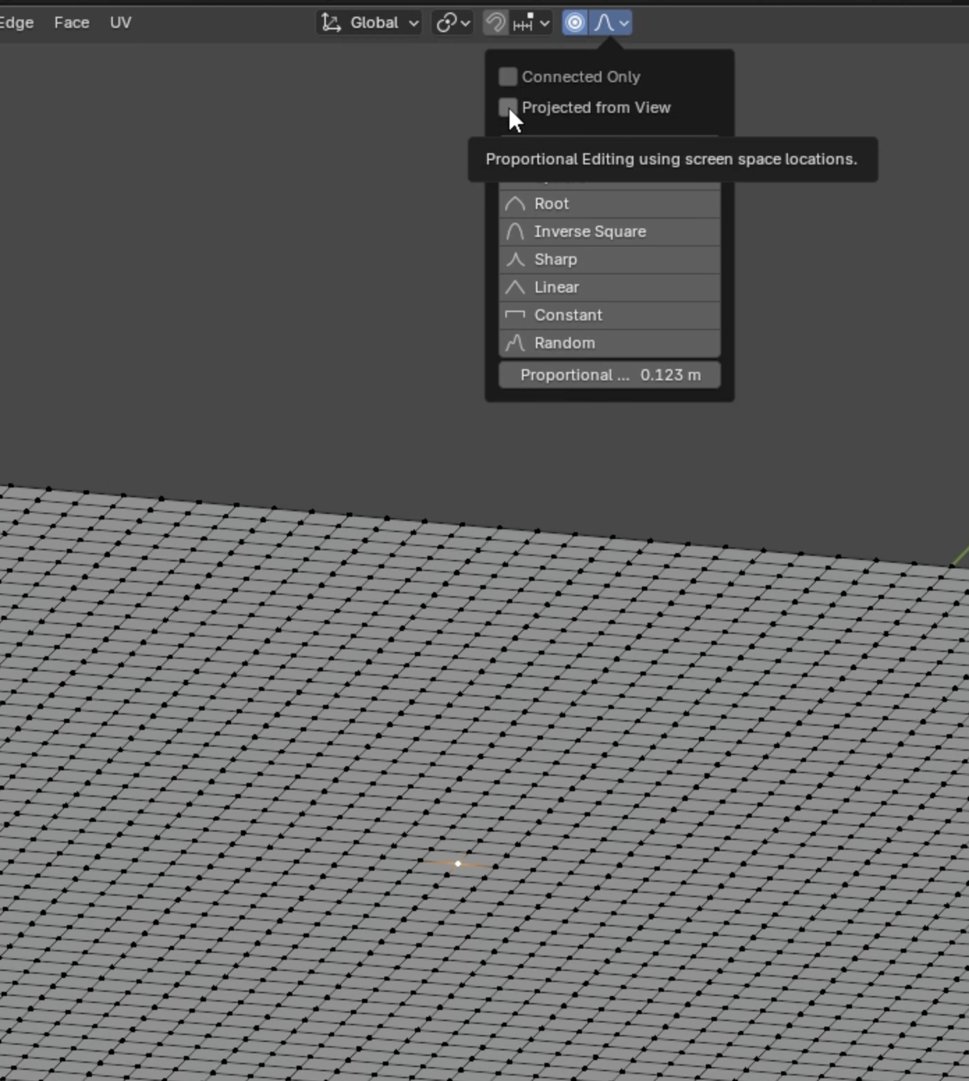Projected From View (뷰에서 투영) 옵션은 현재 뷰에 따라 정점들이 영향을 받습니다. 이는 앞서 설명한 방식과는 약간 다른 동작을 보입니다. 자주 사용되지는 않지만 특정 상황에서 유용할 수 있습니다.