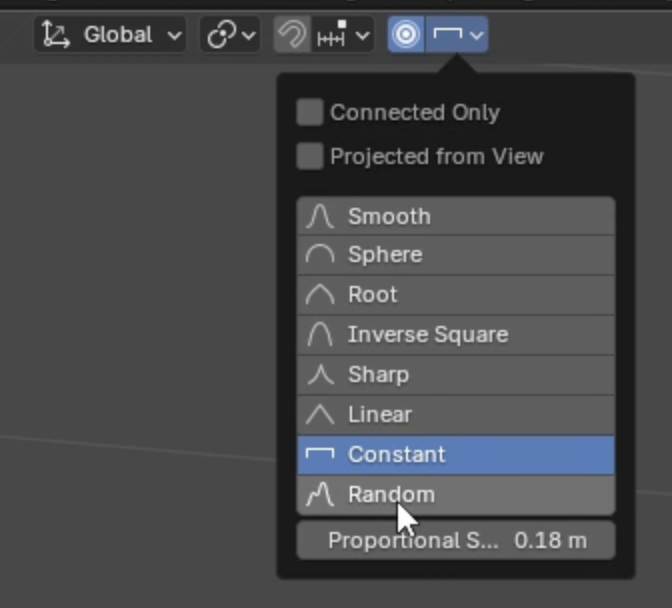 여기에는 다양한 비례 편집 옵션이 있습니다. 이는 영향 범위 내에서 정점들이 어떻게 움직일지 결정합니다.