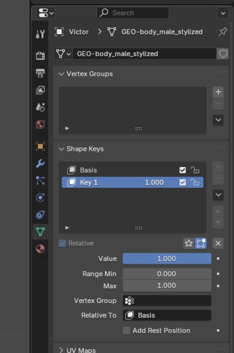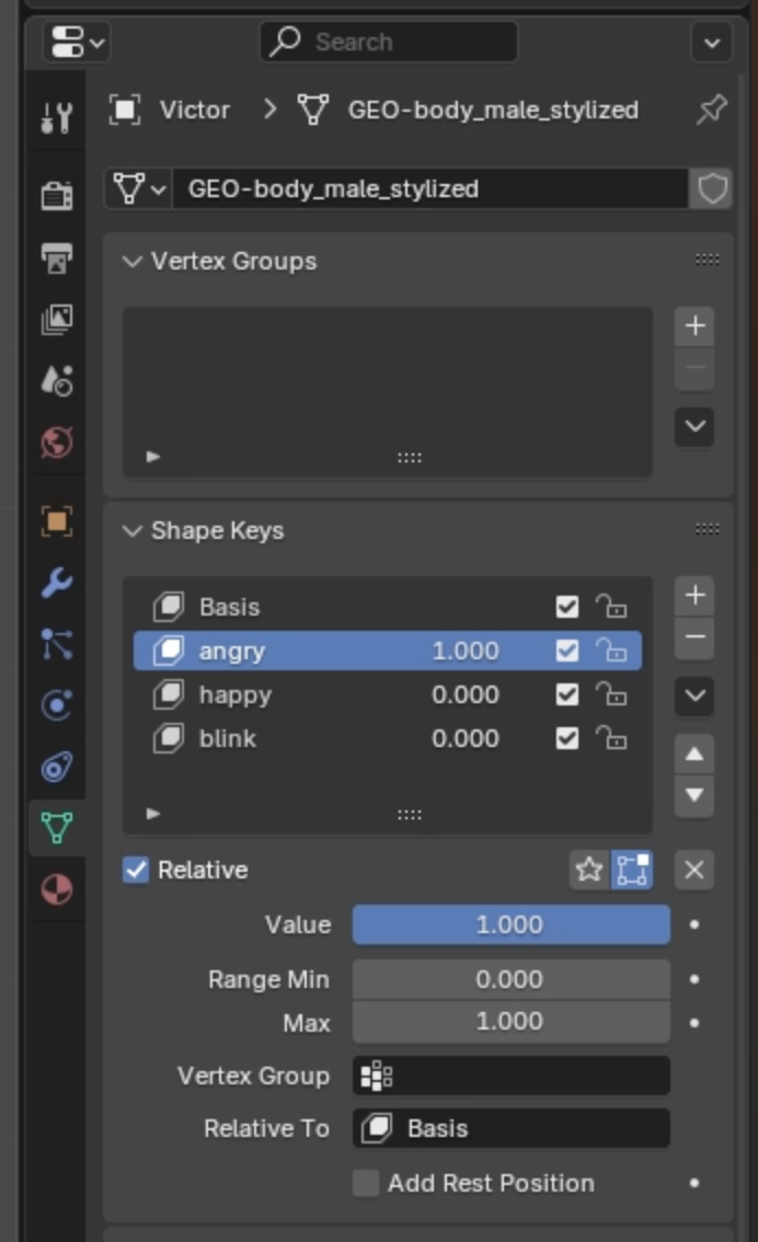 - 이 상태에서 모델의 형태를 변경하면, 변경 사항이 이 'Key'에 저장됩니다. 예를 들어, 빅터를 화나게 만들고 이 셰이프 키의 이름을 'Angry'로 지정할 수 있습니다.