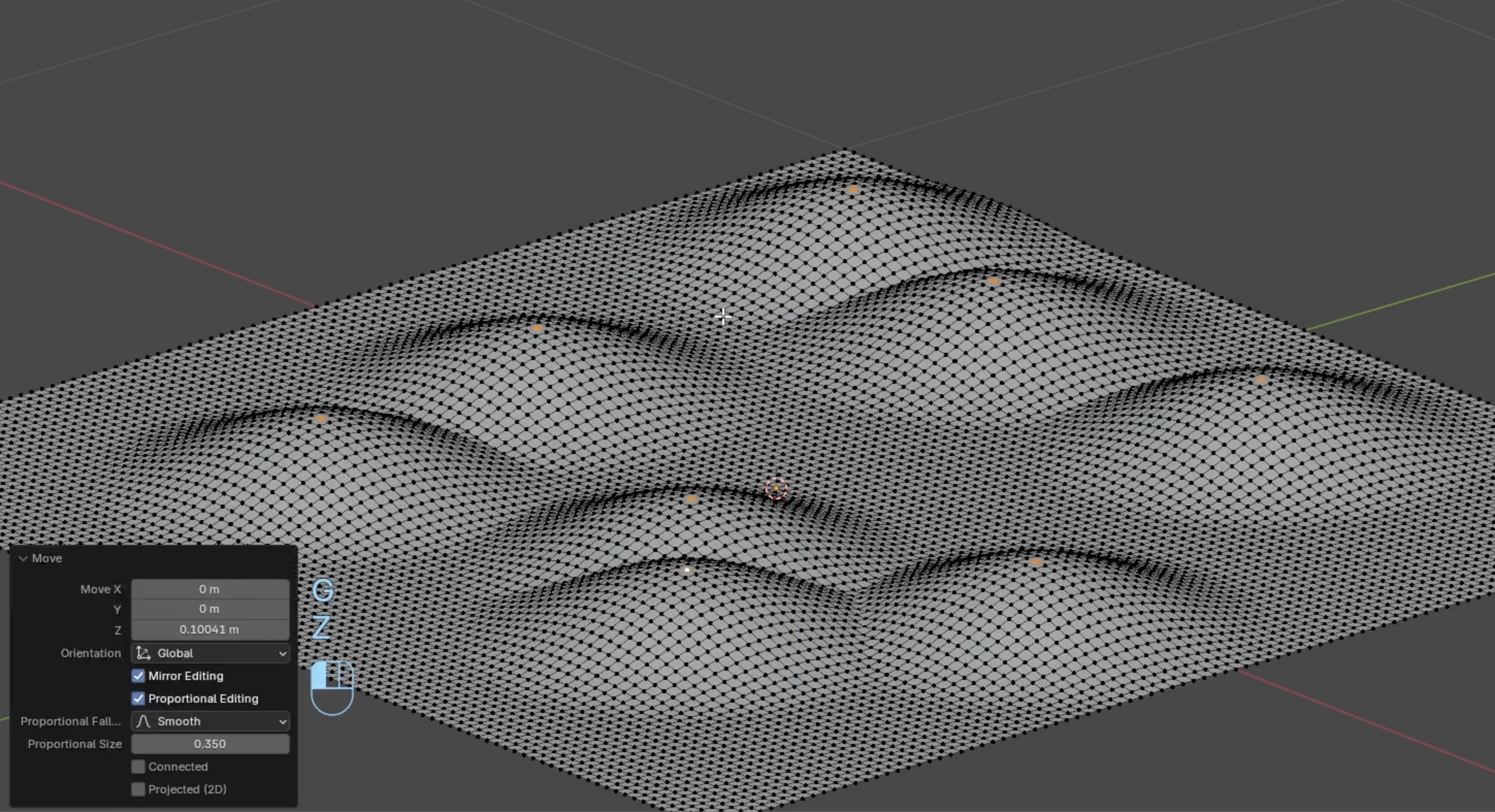 편집 모드(Edit Mode) 로 전환한 후 도구를 활성화합니다. 정점(vertex) 하나를 선택하고 'GZ' (Z축으로 이동)를 누르면, 도구를 사용하지 않을 때는 선택한 정점만 움직이지만, 비례 편집 도구를 사용하면 주변 영역이 함께 영향을 받으며 움직이는 것을 볼 수 있습니다. 마우스 휠을 스크롤하여 영향 범위(zone size) 를 조절할 수 있습니다. 여러 정점을 한 번에 선택하면 더 넓은 영역에 영향을 줄 수 있어, 쉽게 작은 언덕이나 산과 같은 지형(landscape) 을 만들 수 있습니다.