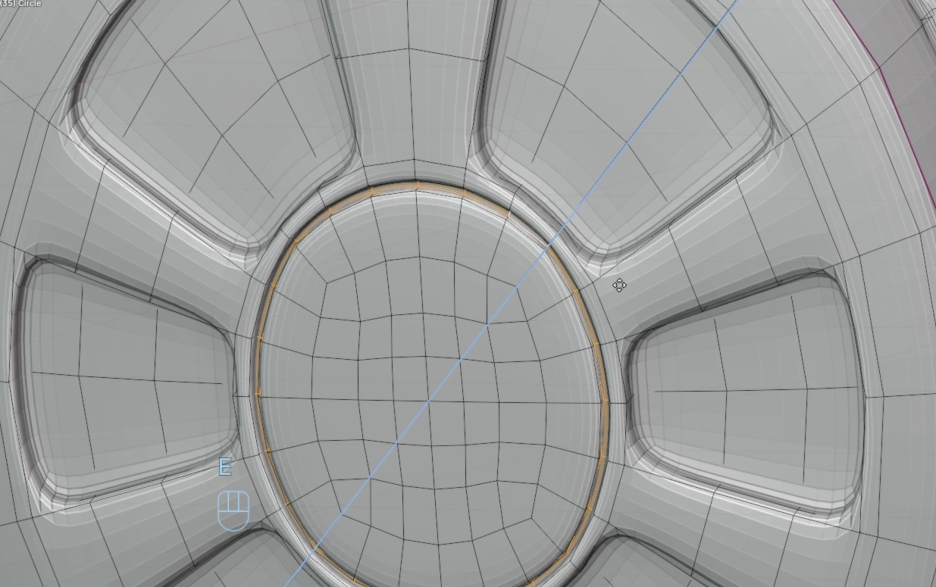 이제 ES로 이 모양 안으로 돌출한 다음 **축(axe)**을 만들 겁니다. EY를 눌러 축을 저쪽으로 놓겠습니다. Shift + E를 사용하여 가장자리를 날카롭게 만들려고 합니다. 이미 노멀(normal)이 뒤집힌 것을 볼 수 있습니다. 쉐이딩이 약간 이상합니다. 노멀을 활성화하면 노멀이 실제로는 안쪽에 있고 바깥쪽에 있지 않은 것을 볼 수 있습니다. 이 부분을 선택하고 Shift + N을 누르면 이미 더 좋아 보입니다.