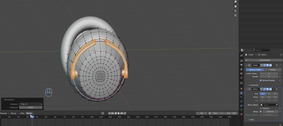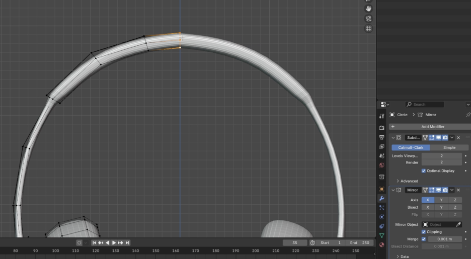 이제 미러 모디파이어의 작은 옵션들을 보는 것이 중요합니다. 첫 번째는 **클리핑(clipping)**입니다. 클리핑을 활성화하면 다른 쪽으로 넘어가지 못하게 합니다. 비활성화하면 G를 눌러 다른 쪽으로 넘어갈 수 있습니다. 하지만 클리핑을 사용하면 직접 다른 쪽에 붙습니다. 그리고 **오브젝트 모드(object mode)**에서 보면 여기에 아치가 있고 여기는 날카롭습니다. 이 날카로움은 원하지 않습니다. 왜냐하면 미러 전에 서브디바이드되기 때문입니다. 하지만 미러가 먼저 되고 서브디바이드가 나중에 되면 이 멋진 모양이 나옵니다. 훨씬 좋아 보입니다.