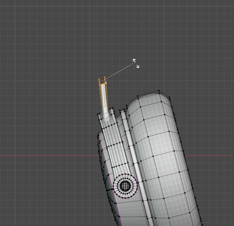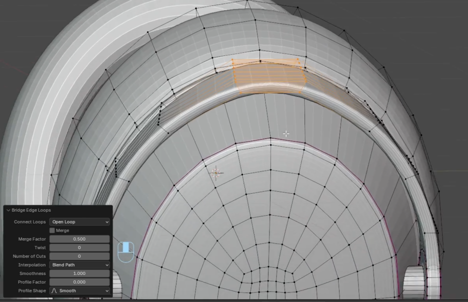 Ctrl + E를 눌러 **엣지 루프 브릿지(bridge edge loops)**를 사용하면 우리가 원하던 모양이 나옵니다. 이 부분은 GZ로 조금 더 뒤로 옮겨서 약간의 각도를 만들고, 그 다음에는 둥근 모양으로 시작하도록 하겠습니다. 물론, 돌출하고 **베벨 도구(bevel tool)**를 사용하거나 하나씩 돌출하는 방법도 있지만 시간이 오래 걸릴 겁니다. 지금 만든 방식이 마음에 들어서 이대로 유지하겠습니다.