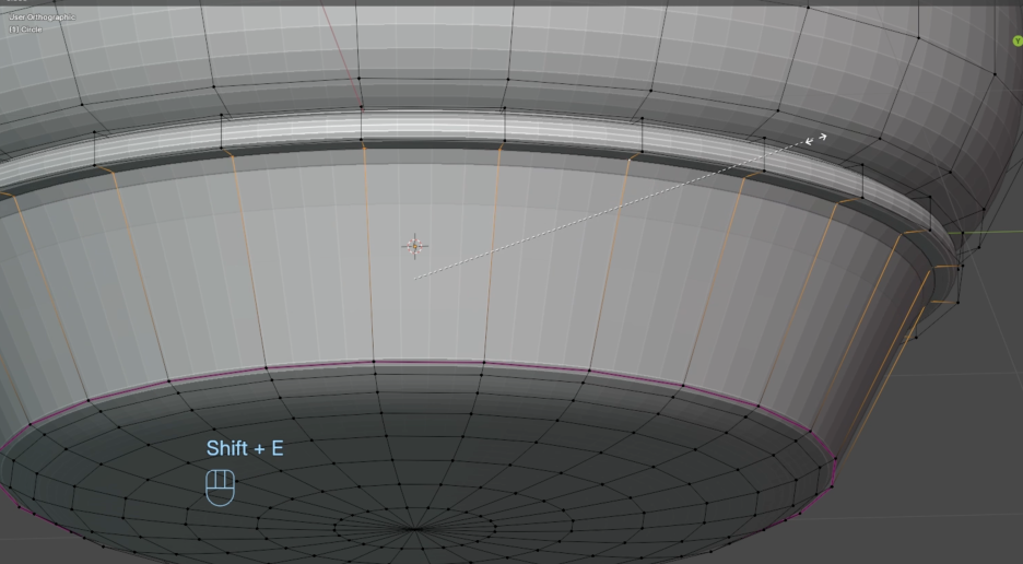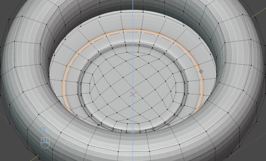 이제 가장자리를 날카롭게 만들 수 있습니다. Ctrl + R로 루프를 추가하고, 안쪽 루프를 Shift + E로 날카롭게 만들겠습니다. 여기도 똑같이 Ctrl + R 대신 Shift + E로 날카롭게 만들 수 있습니다. 이제 이 부분이 안쪽으로 들어가는 것처럼 보이고, 이것이 우리가 원하는 것입니다.
