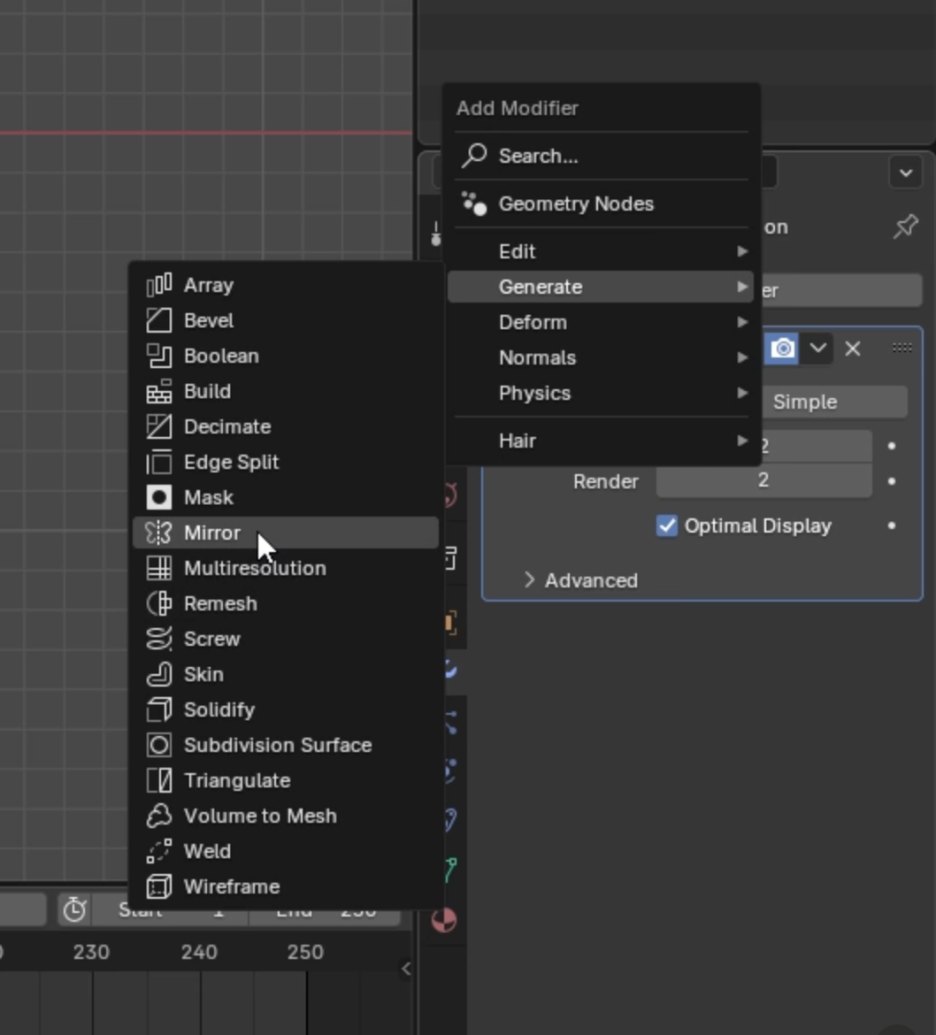 이제 첫 번째 부분이 완성되었습니다. 모든 것을 선택하고 회전시켜서 여기에 배치하겠습니다. 이를 확인하기 위해 **모디파이어(modifier)**에서 생성(Generate) 아래의 **미러(Mirror)**를 추가하겠습니다. **원점(origin point)**을 옮기지 않았다면, 다른 쪽에도 직접적으로 변경 사항이 나타납니다. 여기서 변경하는 사항이 오른쪽에도 나타날 겁니다. 미러 모디파이어는 매우 강력한 도구입니다. 보통 서브디비전 모디파이어 위에 놓습니다. 모디파이어가 어떻게 작동하는지는 나중에 자세히 다룰 것입니다. 여기서는 모디파이어가 위에서 아래로 읽힌다는 것을 이해하면 됩니다. 왜 여기에 놓는지, 그리고 다시 여기에 놓아서 어떻게 작동하는지 보여드리겠습니다.