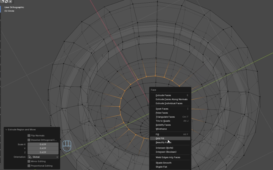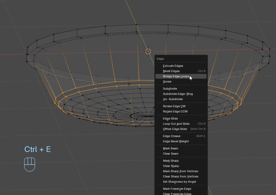 이제 GZ로 도형에 맞춰 정렬하고, **Shift + 클릭(Shift click)**과 Alt + 클릭(Alt click), 그리고 **Shift + Alt + 왼쪽 클릭(Shift alt left click)**으로 두 루프(loop) 사이에 **다리(bridge)**를 만들 겁니다.
