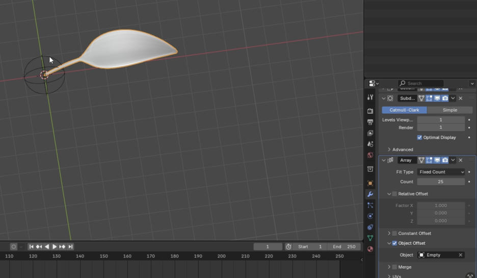 - Empty 개체 추가: Shift + A를 눌러 Empty > Sphere를 추가하고 이름을 "empty"로 변경합니다. Array 모디파이어의 Object Offset 드롭다운에서 방금 생성한 empty를 선택합니다.