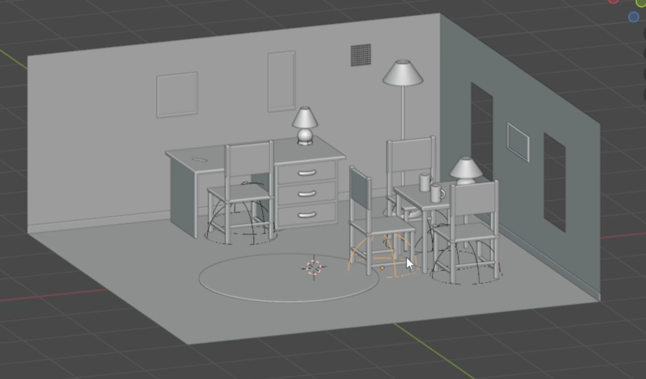 다시 의자를 추가할 수 있어요. 계층 구조를 선택하고 Shift D를 눌러서 저기에 놓고 Z축으로 90도(원한다면 음수) 회전시키면 의자가 잘 놓입니다. 그리고 이것이 우리의 작은 장면입니다. 이 도구들을 사용하는 것이 매우 강력하다는 것을 알 수 있지만, 우선 프리미티브로 모델링하는 방법, 중심점원점을 사용하는 방법, **페어런팅(Parenting)**을 사용하는 방법을 알아야 합니다. 그렇기 때문에 다음 비디오에서 다룰 **편집 모드(Edit Mode)**를 사용하기 전에, 객체 모드에서만으로도 많은 것을 할 수 있다는 것을 아는 것이 매우 중요합니다.