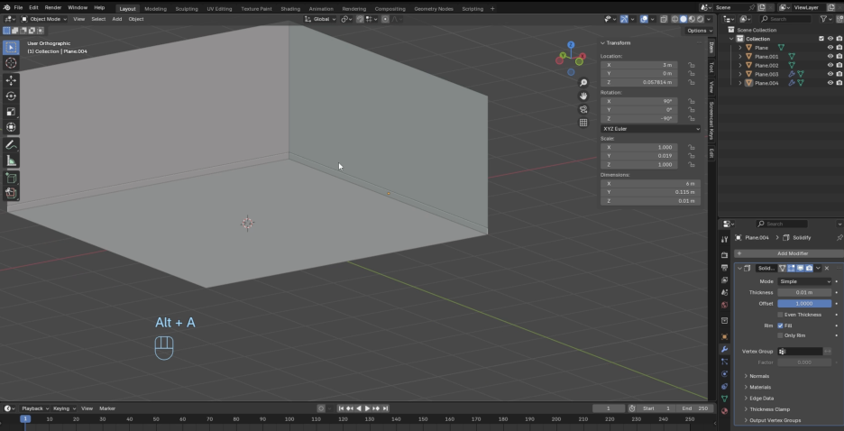 이제 두께를 추가하고 싶은데, 기본적으로 여기서는 보이지 않아요. 하지만 **모디파이어(Modifier)**를 추가할 수 있어요. '생성(Generate)'에서 '솔리디파이(Solidify)'를 선택하면 모양에 두께를 줄 수 있습니다. 첫 번째 벽에 적용된 것을 볼 수 있죠. 우리는 양의 값을 추가해서 이런 모양을 만들고 싶어요. 다른 벽에도 똑같이 '모디파이어'의 '솔리디파이'를 추가하고 양의 값을 주면 됩니다. 이제 더 방 같은 모양이 되었어요.