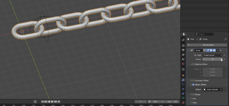 • 체인 만들기: 배열(Array) 수정자를 추가하고 X축 요소를 조정하여 체인을 만듭니다.