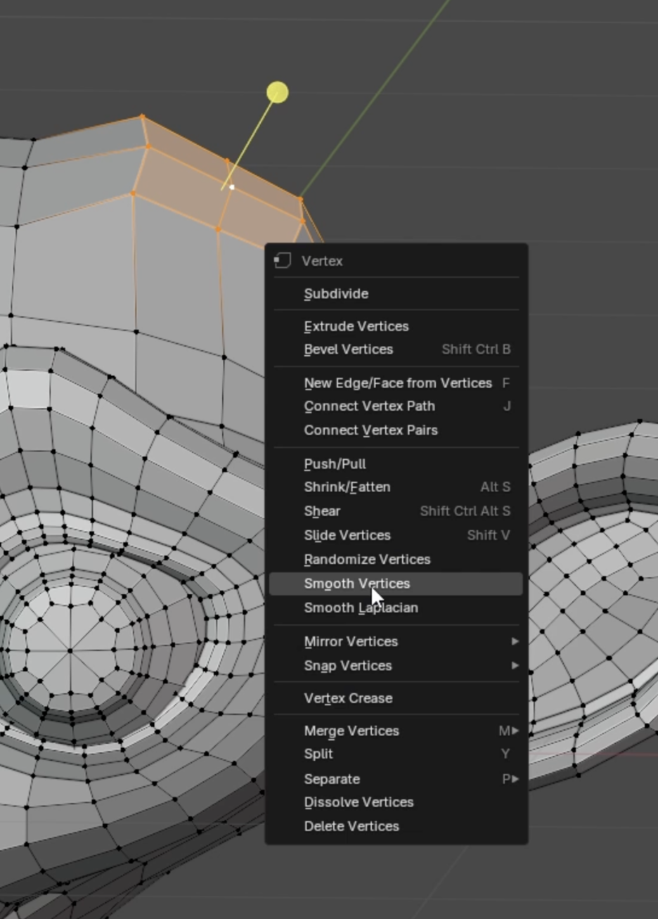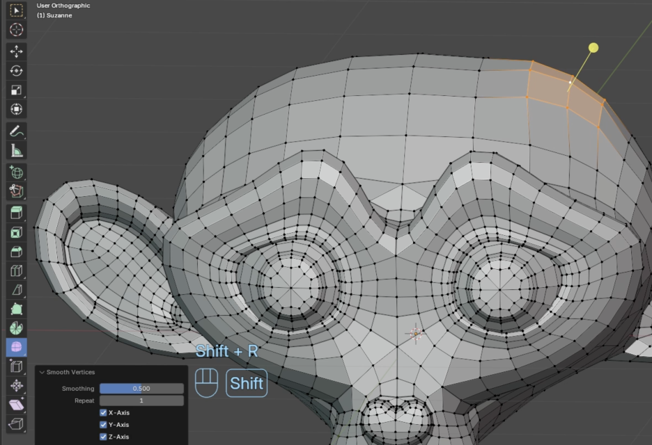 스무스는 **스무스 버텍스 (Smooth Vertices)**라고도 하며, 주로 **유기적인 형태 (Organic Shapes)**를 모델링할 때 사용합니다. 예를 들어, 몽키 모델의 일부를 부드럽게 만들거나, 구멍난 지오메트리를 자연스럽게 닫을 때 유용합니다. 중앙 부분을 선택하고 J를 눌러 면을 만든 다음, 스무스 도구를 사용하거나 Shift+R을 반복하여 더욱 부드러운 곡선을 만들 수 있습니다.