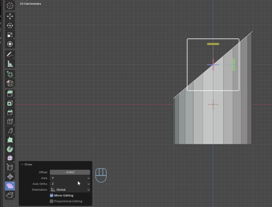 **전단 (Shear)**은 선택한 부분을 회전시키는 대신 모양을 유지하면서 기울일 수 있는 도구입니다. 일반적인 회전(R)은 모양을 왜곡시키지만, 전단은 오브젝트의 형태를 유지하면서 원하는 각도로 기울일 수 있어 특정 각도의 모서리를 만들 때 유용합니다. 예를 들어, 실린더에 45도 각도의 모서리를 만들 때 사용하면 완벽한 모양을 얻을 수 있습니다.