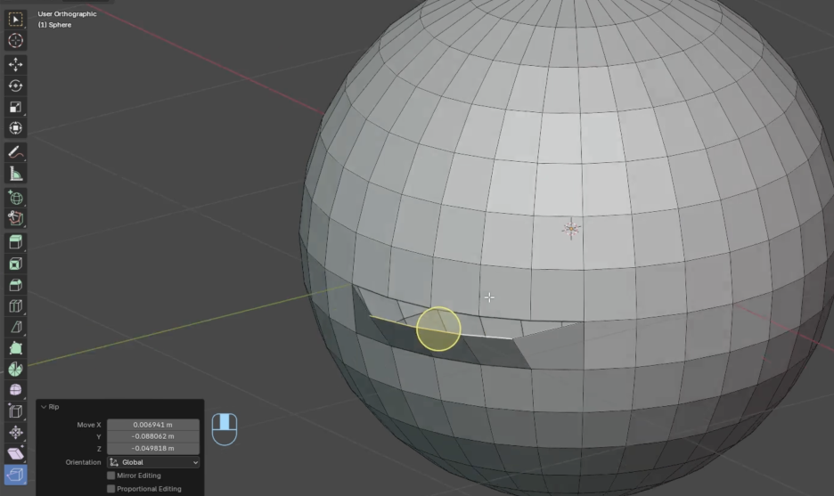 마지막으로 리프 (Rip) 도구입니다. 리프는 선택한 부분을 지오메트리를 열어주는 (Open the Geometry) 도구입니다. 종종 삼각형이나 이상한 지오메트리를 생성할 수 있지만, 닫혀 있는 지오메트리 (예: 입)를 열어 모델링을 시작할 때 유용할 수 있습니다.