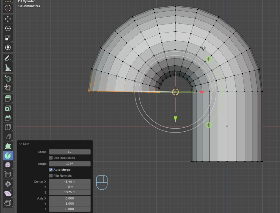 스핀 툴은 아크를 따라 **돌출 (Extrusion)**을 만듭니다. 먼저 Shift+마우스 오른쪽 버튼으로 **3D 커서 (3D Cursor)**의 위치를 설정합니다. 그런 다음 편집 모드에서 면을 선택하고 드래그하면 3D 커서를 중심으로 아크 형태의 지오메트리가 생성됩니다. 파이프 관절 등을 모델링할 때 아주 유용합니다. **세분화 (Subdivisions)**와 **각도 (Angle)**를 조절할 수 있습니다. 예를 들어, 기둥에 적용하여 아치형 모양을 만들 수도 있습니다. 이 경우 **Z 축 스케일 0 (S Z 0)**을 사용하여 Z 축 정렬을 맞출 수 있습니다.