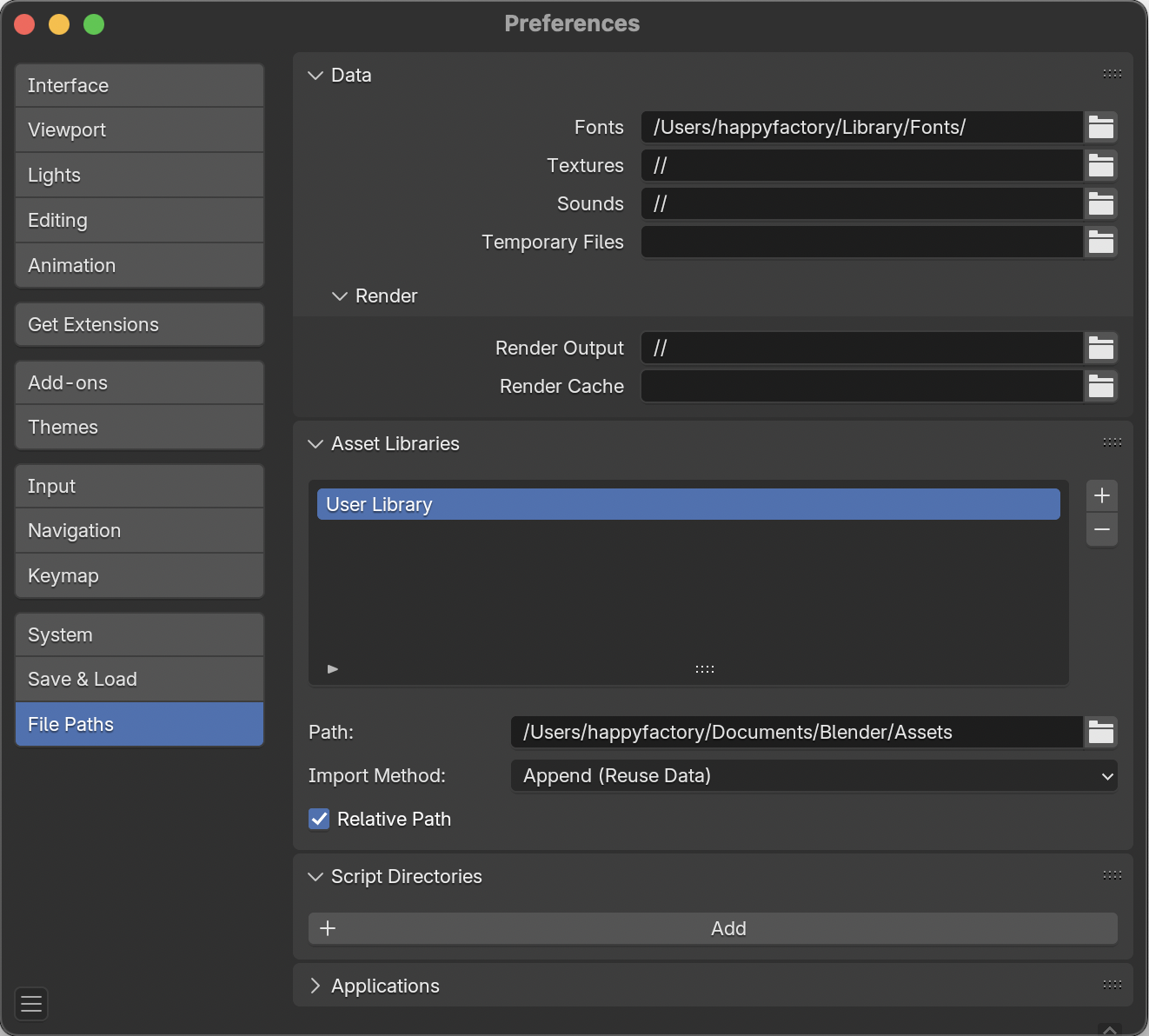 “File Paths” 항목 안에 있는 “Asset Libraries” 섹션으로 갑니다.