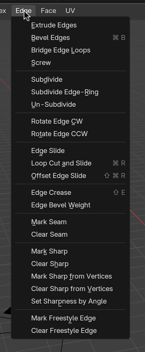 Edge Crease (Shift + E): Subdivision Surface Modifier와 함께 사용할 때 날카로운 에지를 유지할 수 있습니다.