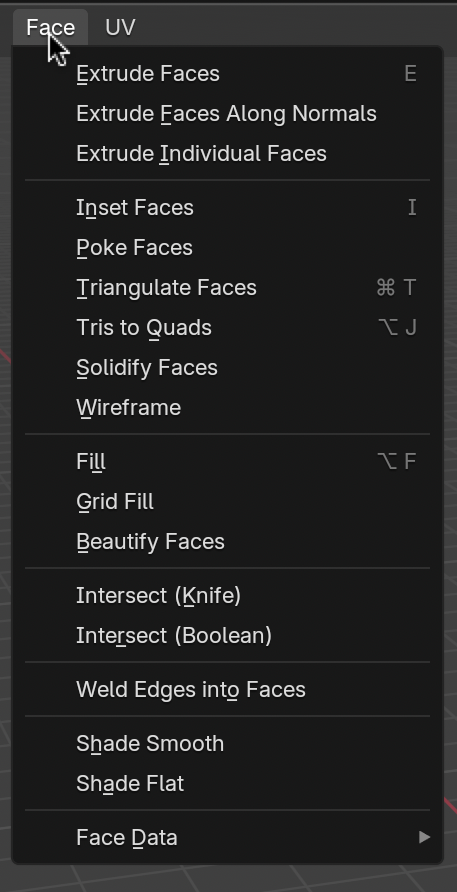 - 각각 Knife Tool, Boolean Modifier로 대체 가능하므로 이 메뉴는 사용하지 않음