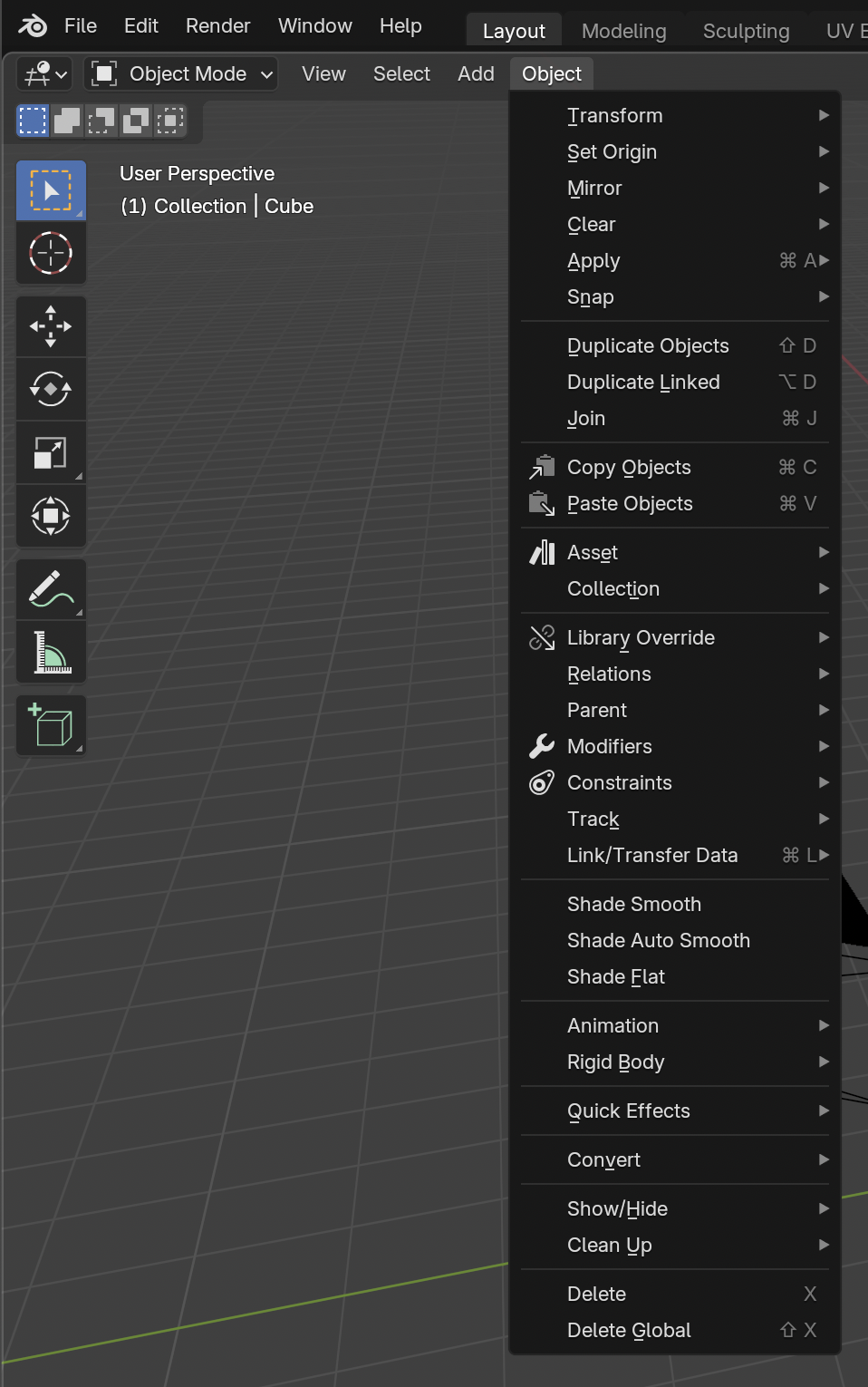 오브젝트를 선택하면 상단에 Object(오브젝트) 메뉴가 생깁니다.