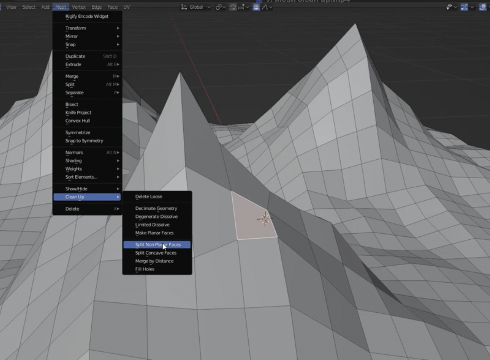 이제 이 메시를 정리해봅시다. **메시 메뉴(Mesh menu)**로 이동하면 Clean Up 항목이 있습니다. 이 메뉴는 따로 설명하기 위해 지금 다룹니다.