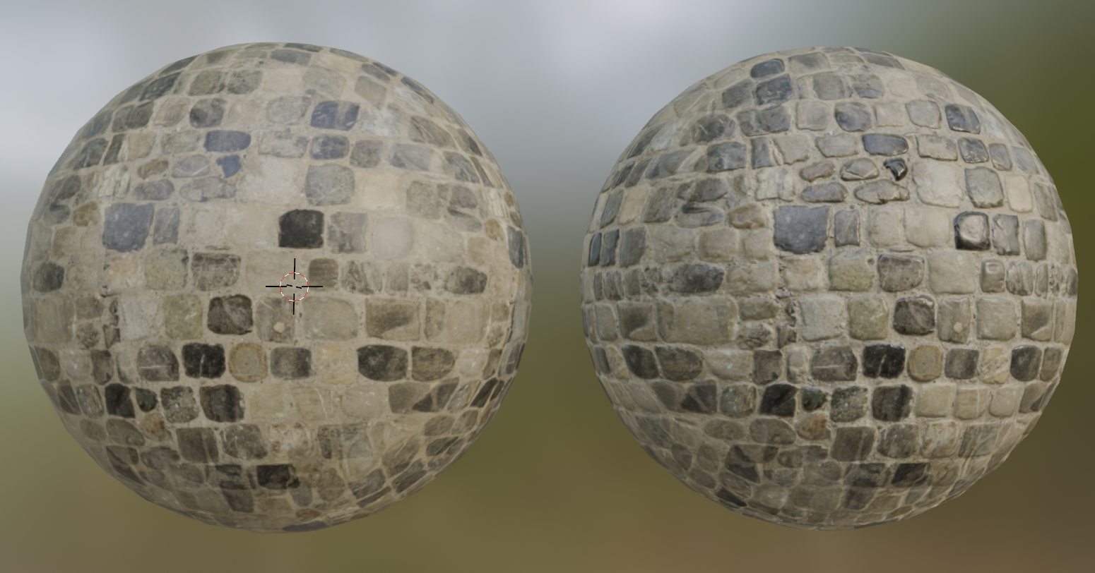 왼쪽 UV Sphere 은 Normal Map이 적용되지 않은 모습이고 오른쪽 UV Sphere 은 Normal Map을 적용한 모습이다. 입체감이 차이가 크다는 것을 알 수 있다.