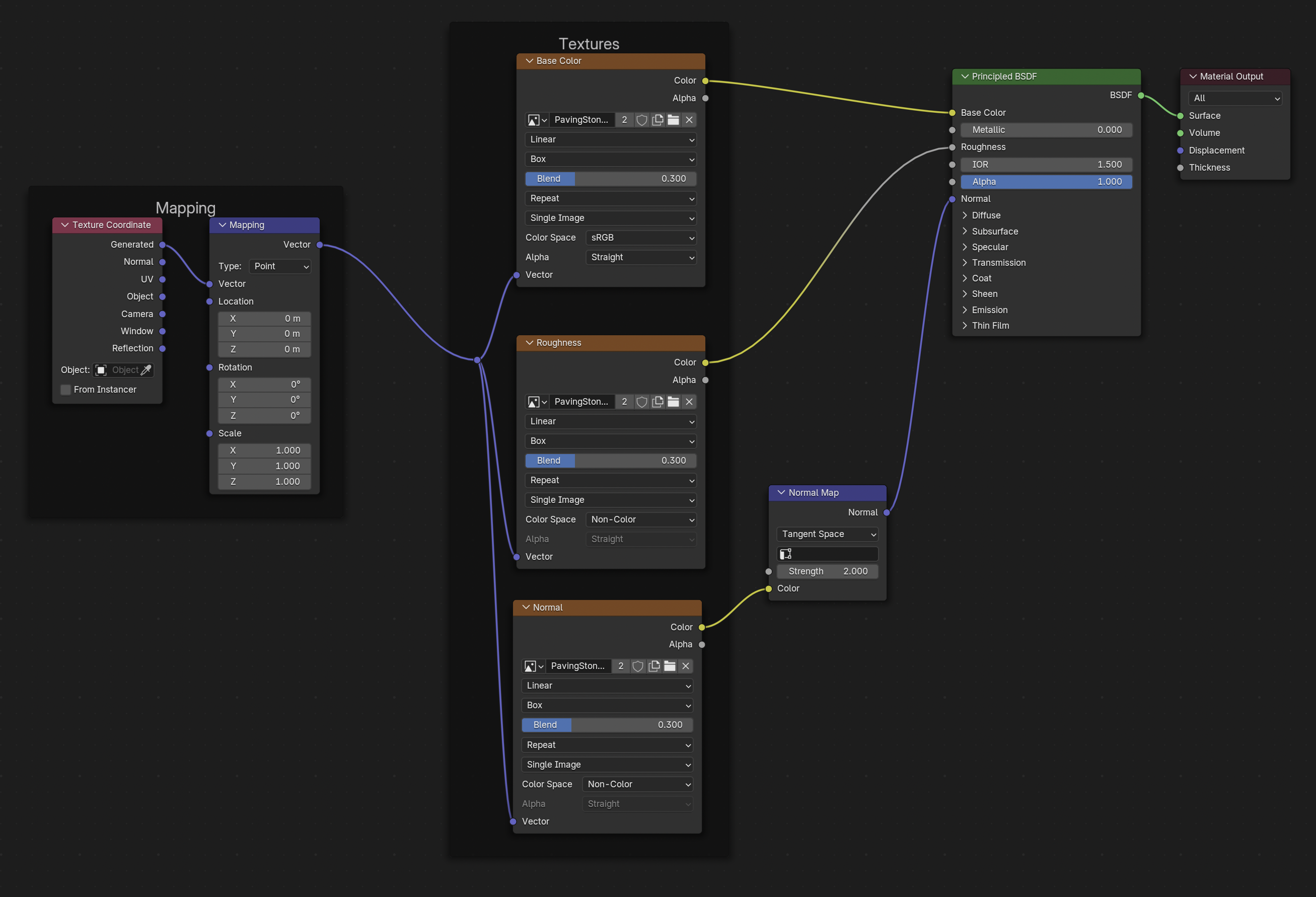- 컬러 공간 설정: 텍스처 노드의 컬러 공간을 Non-Color로 설정합니다.