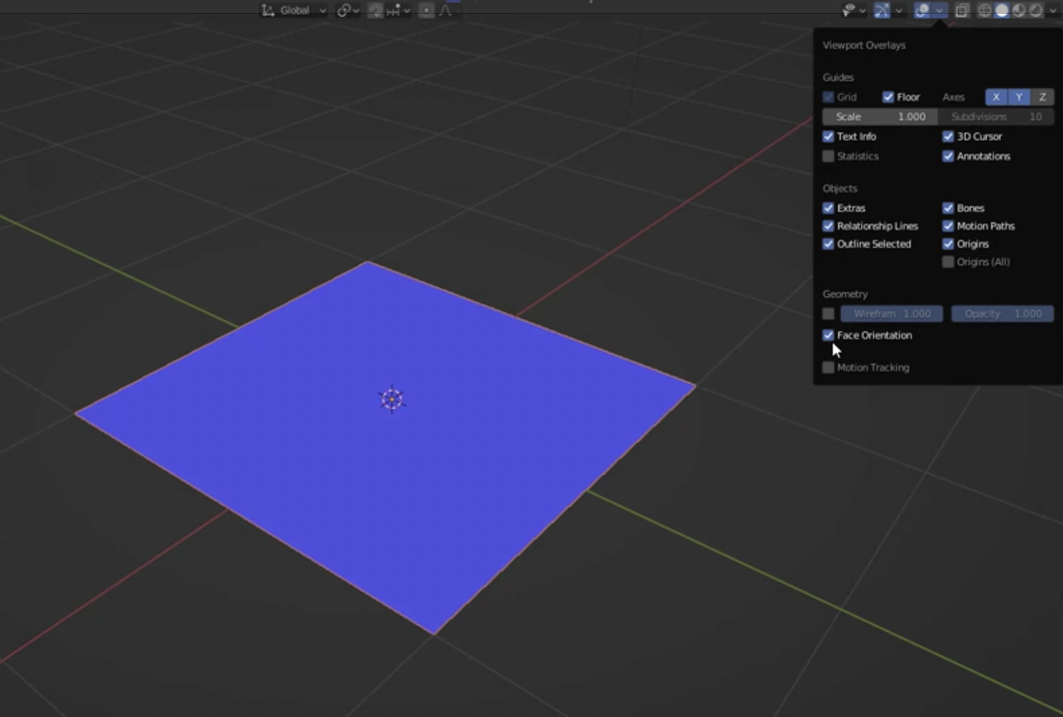 또 다른 방법은 Object Mode에서 Viewport Overlays의 Face Orientation을 켜는 것입니다. 이 기능을 켜면 파란색은 노멀 방향(앞면), 빨간색은 뒷면을 나타냅니다.