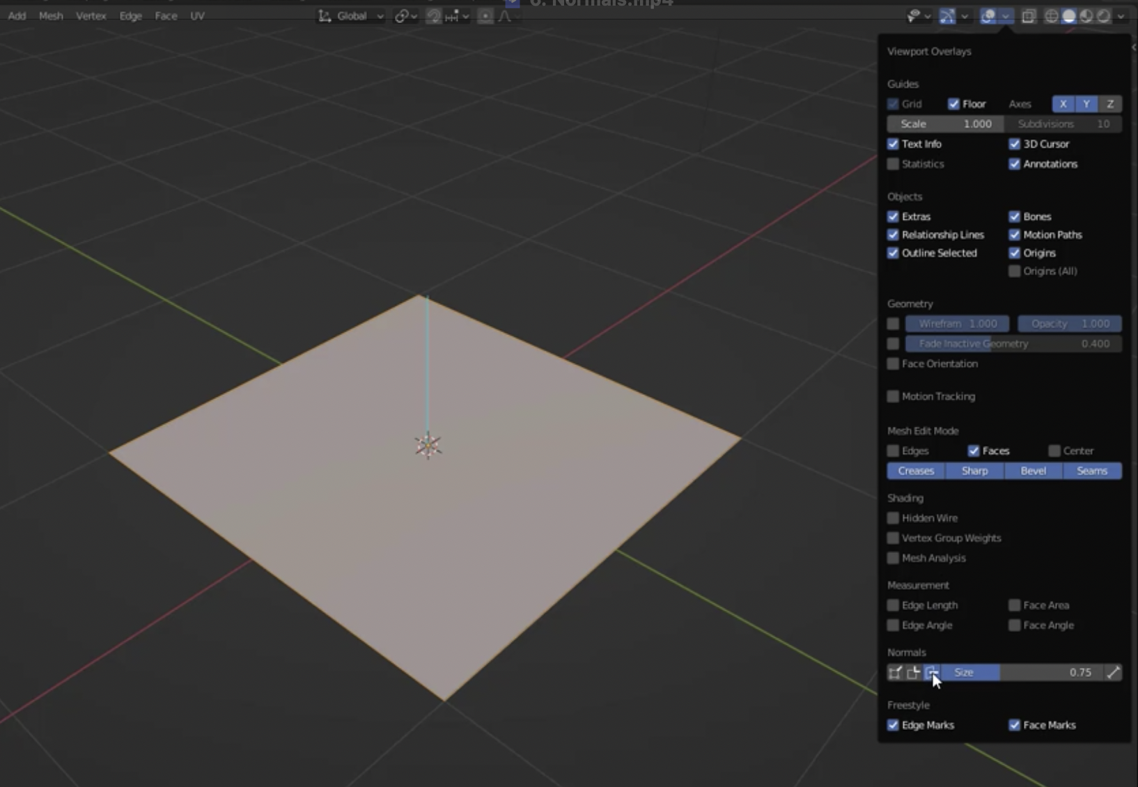 이를 표시하는 방법은 여러 가지가 있습니다. 먼저 Edit Mode로 들어가서 Viewport Overlays로 가면 Normals 섹션이 있습니다. 여기서 Face Normals를 켜면 파란 선이 면의 노멀 방향을 나타냅니다. 이 선이 노멀 방향을 알려줍니다. 이제 이 면의 어느 쪽이 앞면인지 확인할 수 있습니다.