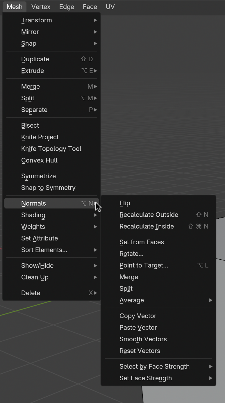 하지만 모델링 중 실수로 어떤 면의 노멀이 뒤집히는 Flip Normals 문제가 발생할 수 있습니다. 이 경우 Mesh > Normals > Flip 또는 단축키 Alt + N > Flip을 이용하면 됩니다.