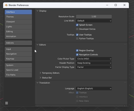 - Preferences (환경설정): 블렌더의 전반적인 설정을 조정할 수 있는 에디터입니다. 여기서 언어나 테마, 단축키 등을 변경할 수 있어요. 중요한 설정 몇 가지만 바꾸면 대부분은 한 번 설정한 후에는 거의 손대지 않게 됩니다.
