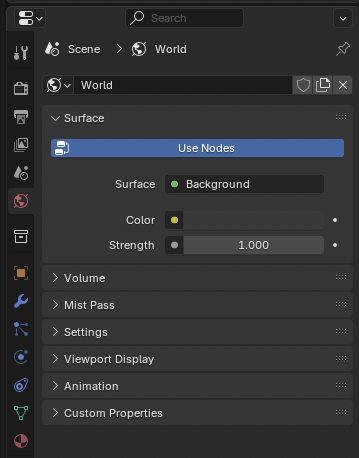 이건 말 그대로 블렌더 안의 세계를 설정하는 공간이에요. 예를 들어 배경의 색상을 변경하거나, HDRI 배경을 넣거나, 조명 환경을 조정할 수 있어요.