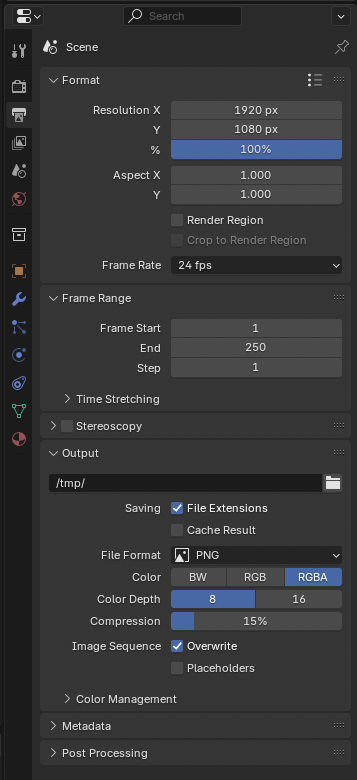 이 설정에서는 렌더 결과물을 어떤 형식으로, 어디에 저장할지 정할 수 있어요. 예를 들어 이미지나 동영상으로 저장할 수 있고, 프레임 범위, 해상도, 코덱 등의 설정도 가능합니다.