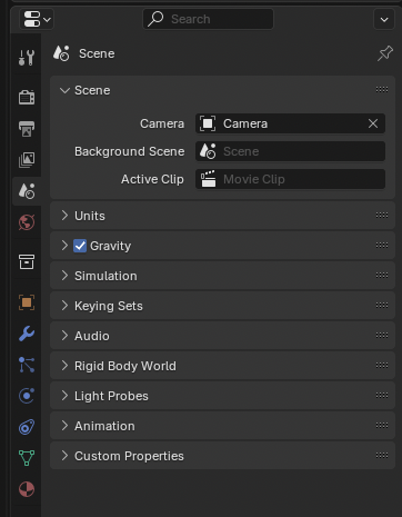 이제 씬(Scene) 속성으로 넘어가면, 여기에서는 단위 설정(센티미터, 인치 등)을 미터법 또는 영국식 단위로 바꿀 수 있어요. 장면 전체에 대한 물리 단위나 중력, 프레임 속도 같은 설정을 관리합니다.