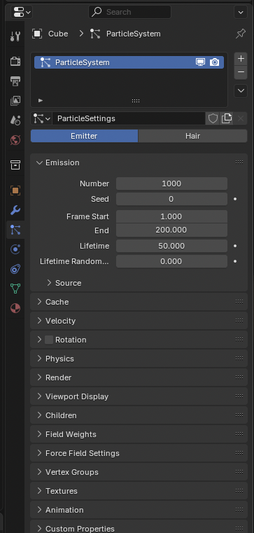 여기서 파티클을 추가하면, 예를 들어 머리카락처럼 보이는 것도 만들 수 있고, 다른 모드로 전환해서 빗질(Comb) 도 할 수 있어요. 정말 재미있는 기능이에요.