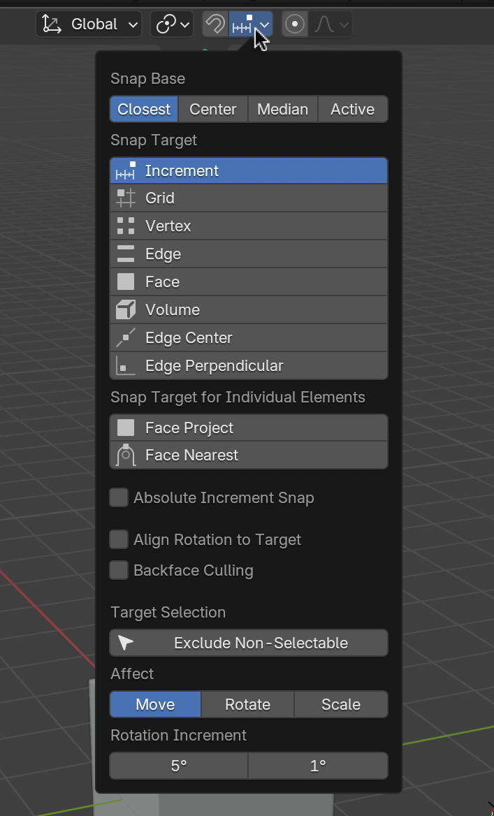 Blender에서 스내핑은 여기 자석 모양의 버튼을 눌러 활성화할 수 있습니다.